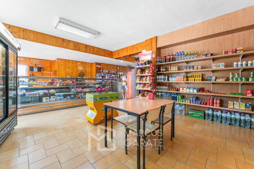 La planta baja alberga un local comercial en pleno funcionamiento como bar y tienda de comestibles, con licencia en regla y listo para operar desde el primer día. Todos los servicios necesarios están disponibles y el negocio está activo, generando actividad inmediata.